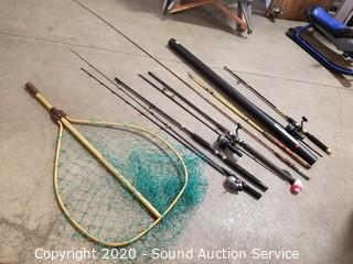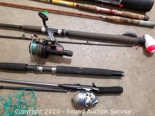 Lot #0024: 7 Fishing Rods w/3 Reels & Net