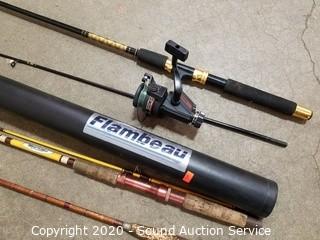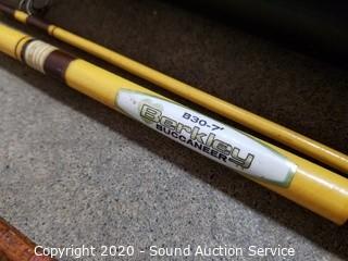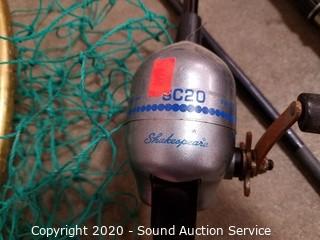 Lot Details: Includes Shakespeare Pro Touch LE PTSP 66-2M 6.5ft rod with Shakespeare Graphite 040 reel, Abu Garcia Conolon Three-Star 5.5ft rod, Abu Garcia 500 Graphite Composite 8ft rod with Eagle Claw 7070 reel, Shimano TDR Aeroglas rod (only the base piece), Shakespeare SC20 5.5ft rod and reel, Berkley Buccaneer B30 8ft rod and bamboo 8ft rod. Net is 26" diameter. Comes with a Flambeau rod case.