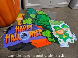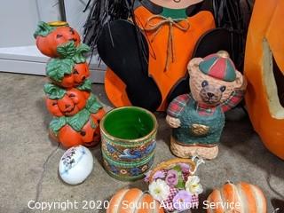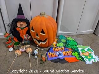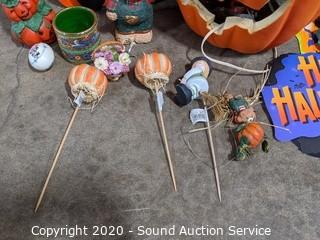 Lot Details: Lighted pumpkin, wood witch and other decorations.