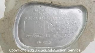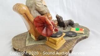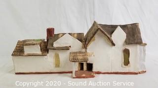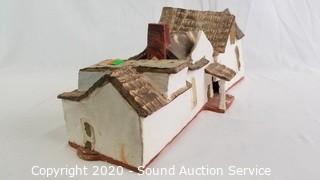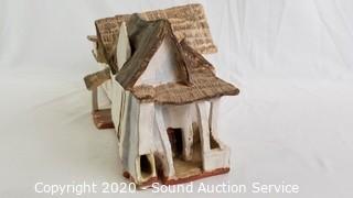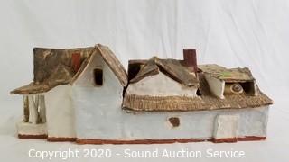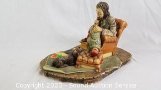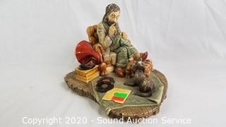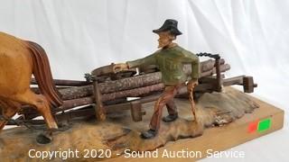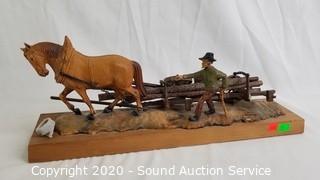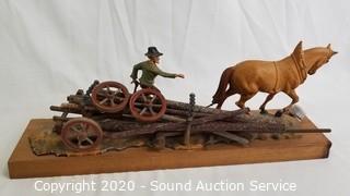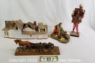 Lot Details: Includes horse drawn logger scene (has some damage, missing one wheel, 5" x 15" x 3.5"), signed "Naturecraft" pottery man with dog sculpture titled "Serenade" 6.5" x 8" x 6", pottery villa sculpture 8" x 18" x 6" and paper mache figure, 14" tall.