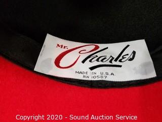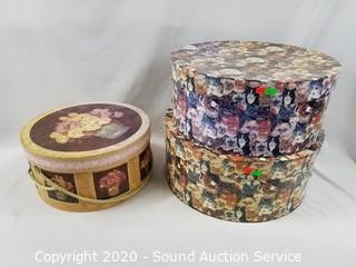 Lot Details: 2 Mr. Charles Felt wool with netting & 3 other woven. Cat print & bouquet hat boxes, smallest is 6" H x 12" Dia, largest is 7" x 15" Dia.