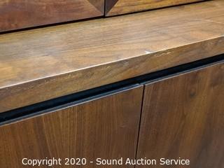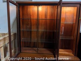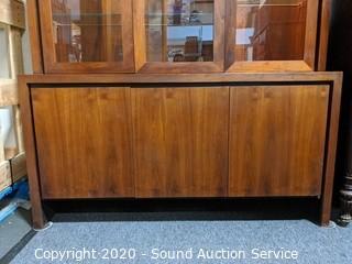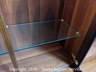 Lot Details: Some minor wear, overall in great condition. 2 piece. Glass shelves, 2 hidden drawers in lower cabinet. 77" H x 56.5" x 19".