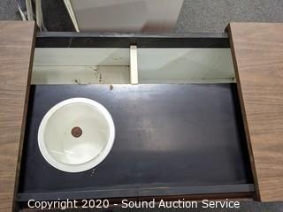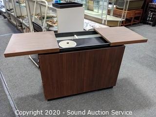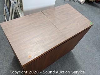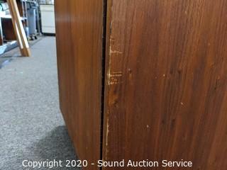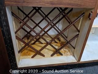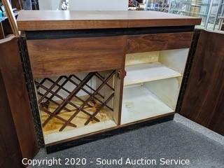 Lot Details: Comes with 1947 Bartenders guide. Nice Teak? veneer finish. Some wear on the inside. 29" H x 37" W x 17" D.