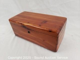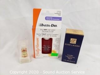 Lot Details: Includes Lane cedar chest salesman sample, 2 jewelry boxes, Estee Lauder light defusing makeup, L'interdit perfume, Sally Hanson insta-dry top coat, floral compact and 2 gold finish mirrored vanity trays 13" x 9".