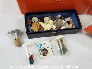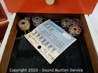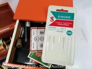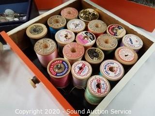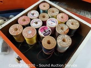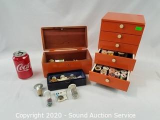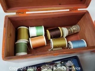 Lot Details: Organizer is 5 drawer, 10" x 6" x 5". Chest is 4" x 9" x 4.5". Comes with sewing thread, buttons, thimbles, bobbins and more.