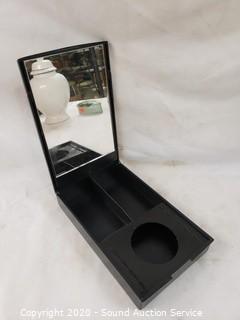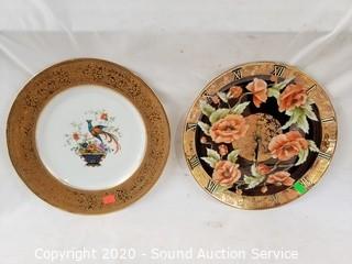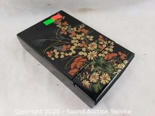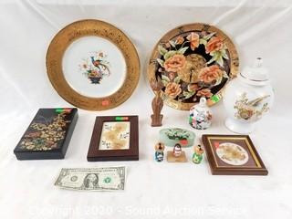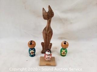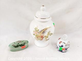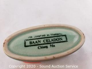 Lot Details: Includes quartz clock, Baan Celadon trinket dish, porcelain bell, urn, carved wood cat, black lacquer makeup box and more.