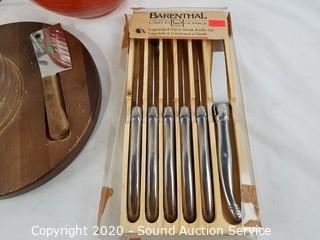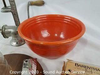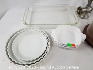 Lot Details: Includes Regal grinder, Corning pie pans and petite pan, Bauer mixing bowl (has a chip), casserole dish and cheese plate.