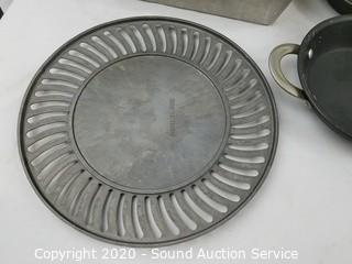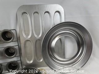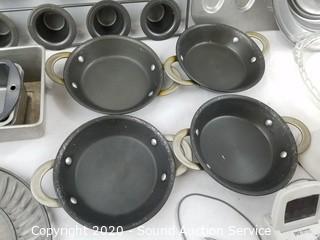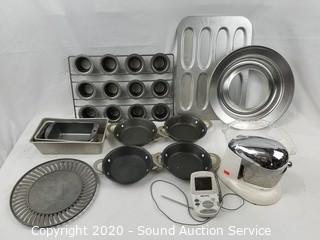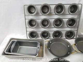 Lot Details: Includes muffin pans, Calphalon 7" skillets, loaf pans, juicer, digital thermometer, pie pan.