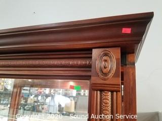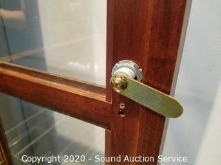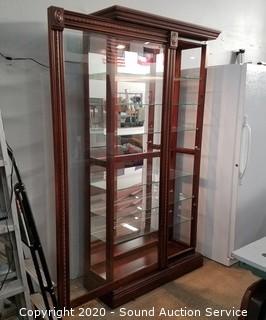 Lot Details: Carved wood accents, lighted, mirrored back, 6 adjustable glass shelves, side access. Locking, does not come with key. Stuck in the lock position so door won't close all the way. 80" T x 40.5" x 14.5". Notice a few small scuffs and scrapes, otherwise in great condition.
