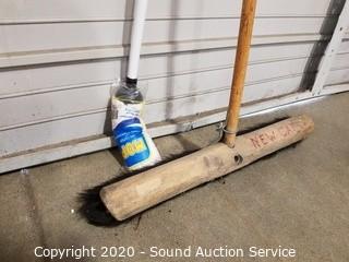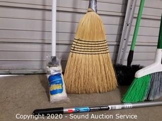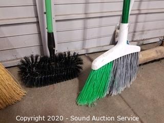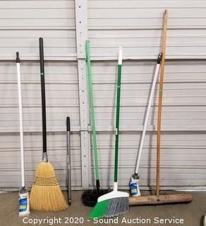 Lot Details: Includes push broom, 2 kitchen brooms, 2 mops, handle and scrub brush.