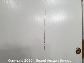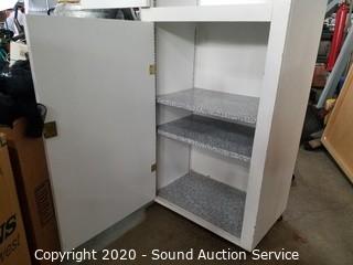 Lot Details: White finish, one adjustable shelf. Locking upper and lower cabinets with key. Some wear to the finish. 77.5" x 24" x 16".