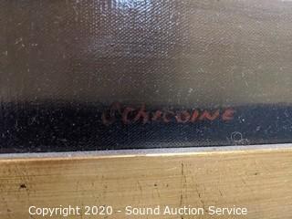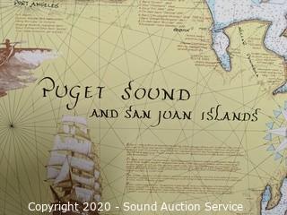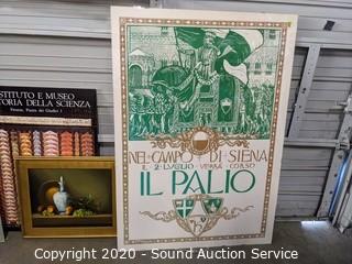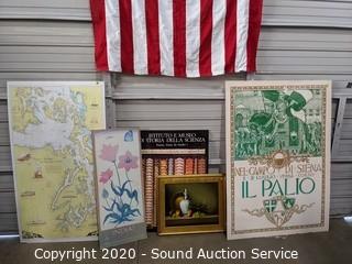 Lot Details: Includes Il Palio Siena Italy Horse Race poster 55" x 39", Italian poster 37" x 27", India floral and butterfly poster 39" x 16", Puget Sound & San Juan Island map 54" x 30" and signed Schicoine still life oil painting 21" x 25".
