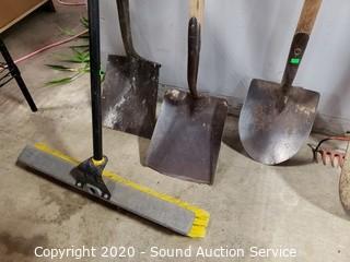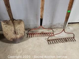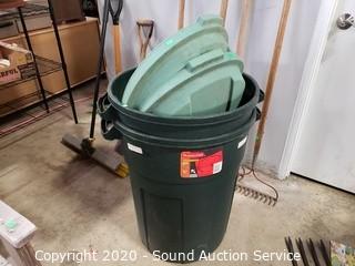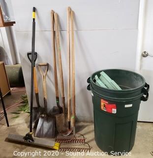 Lot Details: Both trash cans come with lids. Includes 2 brush rakes, 2 spade shovels, cultivator, push broom, & 2 short square shovels.