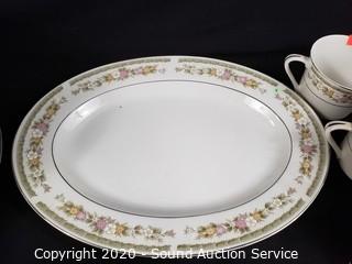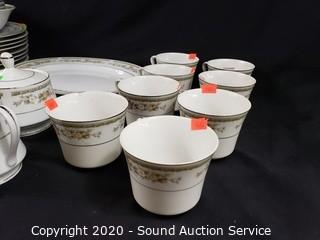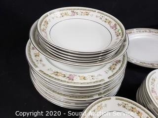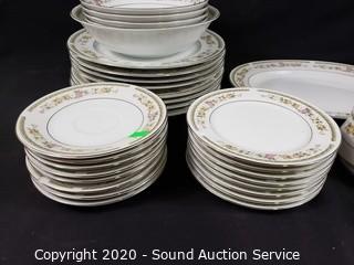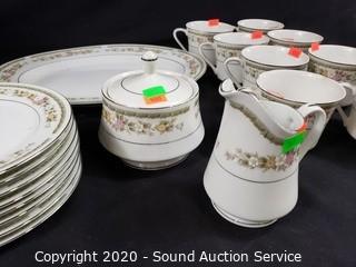 Lot Details: Made in Japan. Includes 8 dinner plates, 8 cups, 8 saucers (one has a large chip), 8 snack plates, 5 soup bowls, 9" serving bowl, 14" platter, cream and sugar.