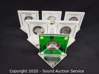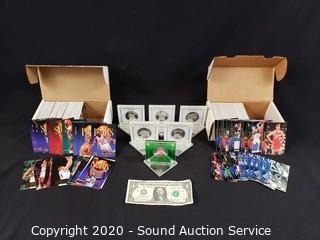 Lot Details: Includes Upper Deck and Skybox basketball trading cards, Lakers, Clippers, Golden State Warriors, Phoenix Suns, Seattle Super Sonics and Portland Trailblazers team medallions with slabs. Comes with original purchase receipt for the medallions. Cards appear to be in mint condition.