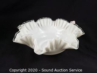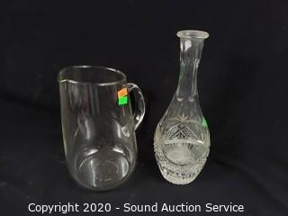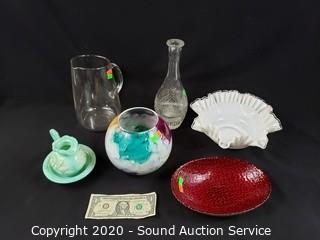 Lot Details: Includes Avon miniature jade milk glass pitcher and basin, silver and ruby dish, ruffled edge bowl, colorful vase, crystal decanter and pitcher. 2" to 11" tall, 3.5" to 8" diameter.