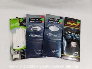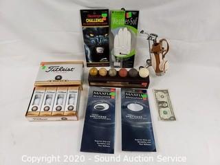 Lot Details: Includes 4 gloves (women's small, medium and large, left hand), golf ball trinket box, golf bag with cart and set of 12 Titleist Pro V1 golf balls.
