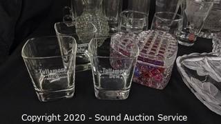 Lot Details: Includes hot toddy glasses, Tullamoure highball glasses, crystal vase, crystal perfume bottle, crystal center bowl, crystal and clear glass candle holders and votives, crystal footed dish, McCormick highball glasses, crystal platters and more.