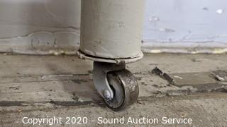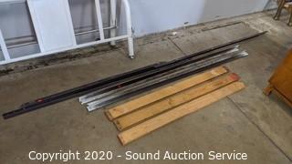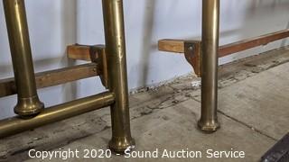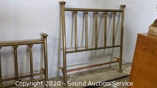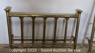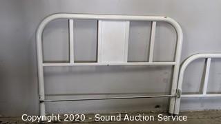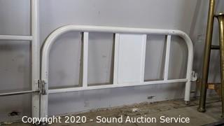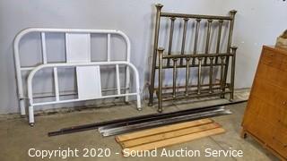 Lot Details: Includes brass headboard and footboard, 36" and 56" tall, 56" wide (comes with some sort of rail system, unsure how it connects together) and white painted steel bed frame with rails, 27" x 42" tall, 53" wide.