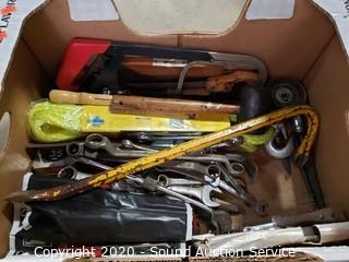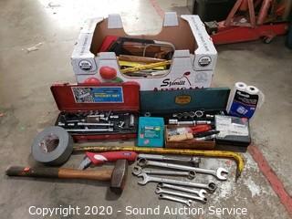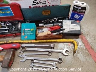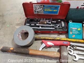 Lot Details: Crowbars, mallets, wrenches, hack saw, cross cut saw, duct tape, paint brushes, staple gun, Makita driver kits, sockets, ratchets and more.