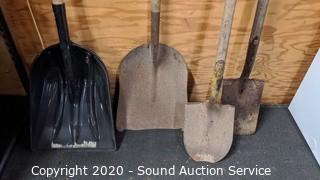 Lot Details: Snow, spade and square shovels, 2 pickaxes and post hole digger.