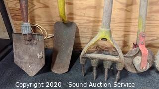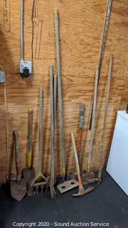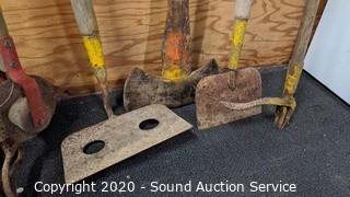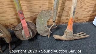 Lot Details: Large hoe, edger, cultivator, mattock, aerator, double bit axe, scraper and clam shovel.