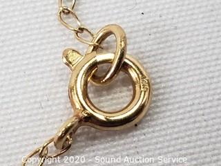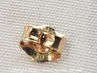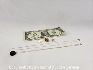 Lot Details: TW 2.5 grams 14K gold necklace and earrings, 10K gold ring 2.3 grams, 10K petite 16" necklace TW 0.7 grams. One of the earrings is missing the center setting.