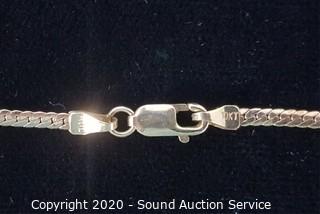 Lot Details: Chain and pendant are one unit. Approx. 17" L. Pendant is encrusted with (17) 2mm diamonds. Total weight: 4.5 grams. ATTN: We are not jewelry experts or appraisers, please use your own judgement when bidding.