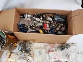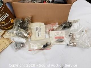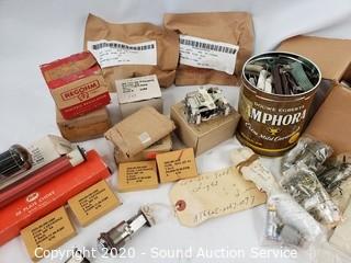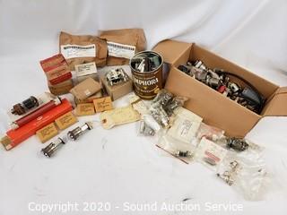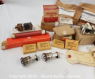 Lot Details: Includes relay armature, terminals, connectors, plugs, fuse cartridges, RF plate choke and more.