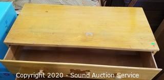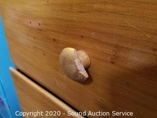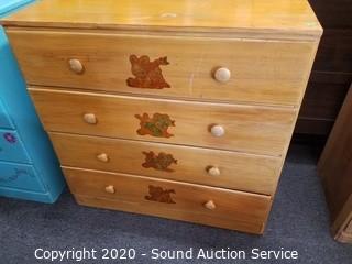 Lot Details: Some wear to the finish and bunny sticker accents on the drawers. One of the pulls is broke. 35" H x 35" W x 15" D.
