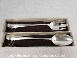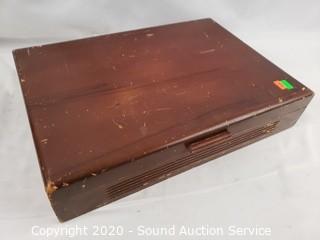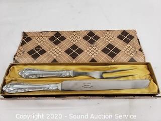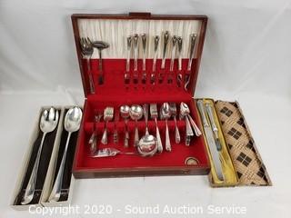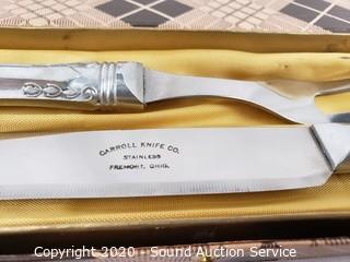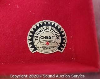 Lot Details: Some wear to the chest, 3" x 16" x 11". Comes with Garity salad fork and spoon set and Carroll Knife Co. carving set.
