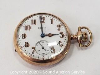 Lot Details: Illinois is 19 jewel, serial 3003356, 15.2 grams marked "14K fine gold" on the case, works. Elgin is serial 17440508, 15 jewel, 28.1 grams, not working.