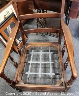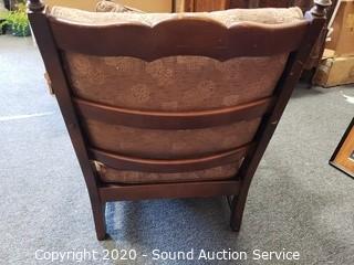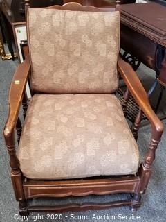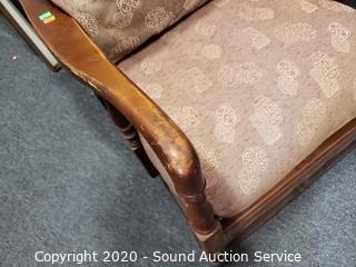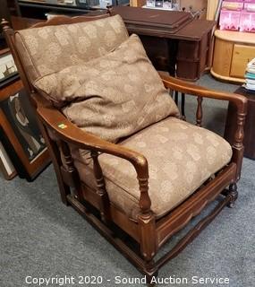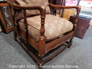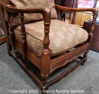 Lot Details: Some wear to the walnut? finish otherwise good condition. Cushions are heavy, comes with matching back pillow. Cross spring supports. 34" H x 27" x 34" D x 16" to seat.