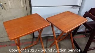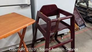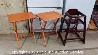 Lot Details: 27" H x 13" W x 12" D. high chair, 28" H x 15" x 19" TV trays.