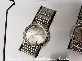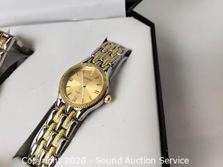 Lot Details: Stainless & gold tone w/gold face & Stainless with silver face. All need new batteries. Comes with original boxes. Boxes may have some damage. Each set has $149 original price tag.