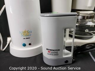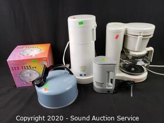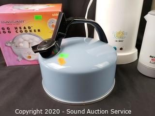 Lot Details: Includes Remington Hot Beverage & Coffee Maker, Mr. Coffee Ice Tea Maker, Mr. Coffee 8-cup coffee maker, Toast Master Egg Head egg cooker and Regal 2.5qt tea kettle. Egg cooker comes with original box.