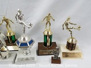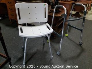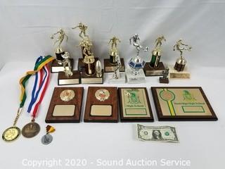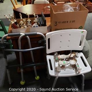Lot Details: Globe Steel Roller Skates & Union Ice Skate Blades, Various Sports Trophies, Plaques & Medals, 19 Crystal Stemware Wine Glasses, Medical Device Walker & Shower Chair.