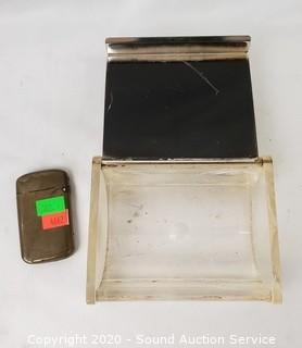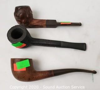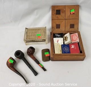 Lot Details: Includes Darby Starfire Doctor Grabow and other pipes, acrylic trinket box 2" x 4.5" x 3.5", brass match container and inlaid wood trinket box 2.5" x 6" x 6".