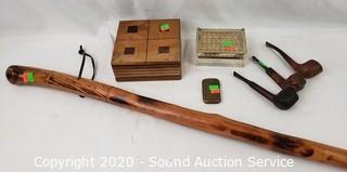 Lot #0182: Briar Wood Pipes, Walking Stick & Trinket Boxes