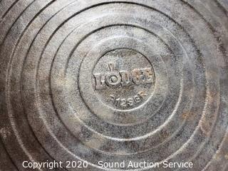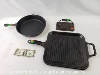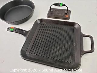 Lot Details: Bacon press and flat griddle are Lodge, other skillet is 10".