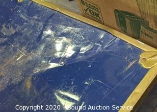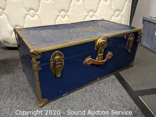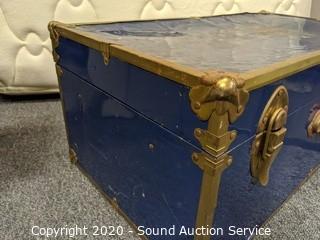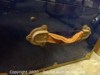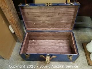 Lot Details: Tote is 28" x 18" x 18, lid is slightly caved in and has a crack. Trunk is 12.5" x 30" x 16", has various wear (top is dented, metal band around the bottom has come free, missing one leather handle, various scuffs and scratches).