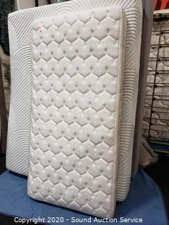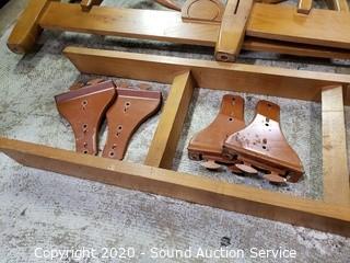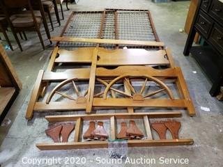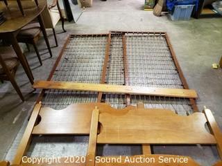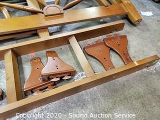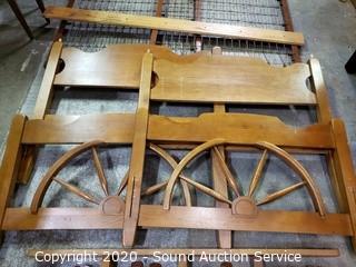 Lot Details: Only comes with one mattress. Currently unassembled, looks to be complete with 8 brackets and many nuts and bolts. Comes with ladder. Various wear to the finish, one of the dowels on one headboard is broken and will need to be replaced to assemble. Mattress appears to be in good condition.