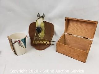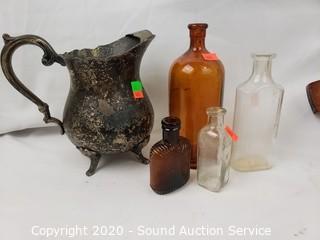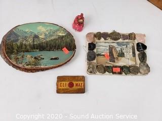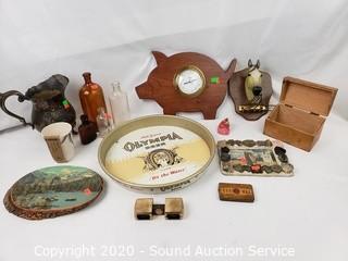 Lot Details: Includes hydrometer, Bamboo shark tumbler, Climax tin, collectible stone picture frame, apothecary bottles, Olympia Beer tin tray and more.