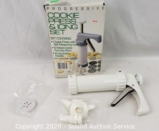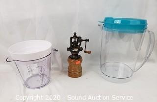 Lot Details: Cookie press, drink pitcher, juicer, various utensils and trays.