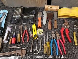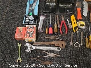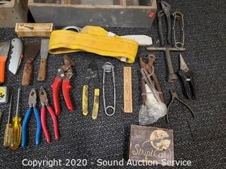 Lot Details: Includes leather and basal wood scraper, sewing awl, adjustable wrenches, pliers, screwdrivers, wire stripper, lanyard belt, scrapers, punch set, pop rivet tool, wrenches and more. Box is 4" x 18.5" x 7".