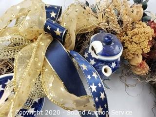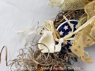 Lot Details: Wreath is adorned with mini porcelain teacups and saucers (one cup is broken), 19" diameter. 13" and 16" diameter stained glass.
