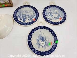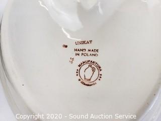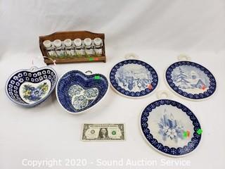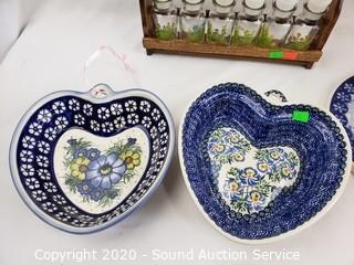 Lot Details: Includes Cergor and Unikat heart dishes, 3 Boleslawiec trivets and 6" x 11" spice rack with 6 jars. 8.5" heart bowls and 8" trivets.