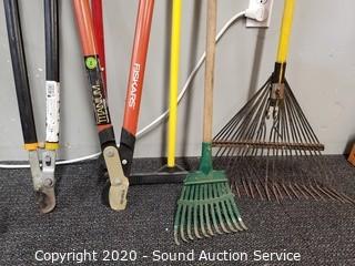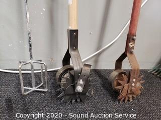 Lot Details: Includes leaf rake, loppers, paint mixer and more. Cart is 39" x 16" x 14".
