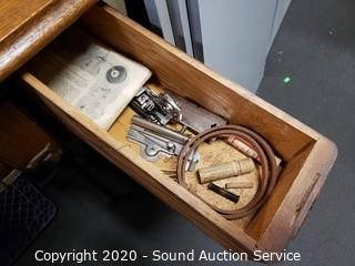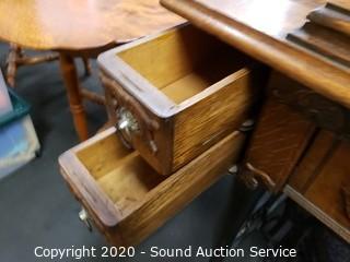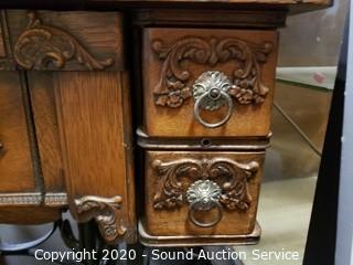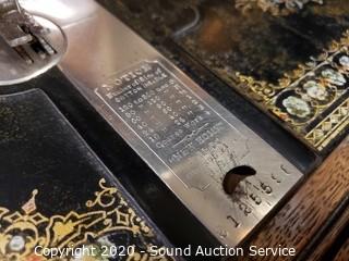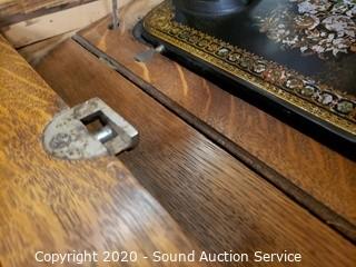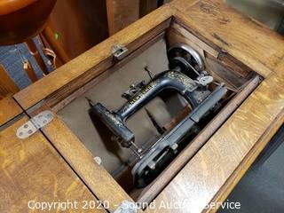 Lot Details: Serial 2125598. Last patent date August 1887. Sewing machine appears to work, feels a little gummed up. Tiger oak cabinet with cast iron frame. 31" x 34" x 19". Some wear to the finish and chipping. Machine wont stay up, missing a piece to latch it in the upright position.