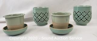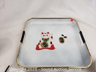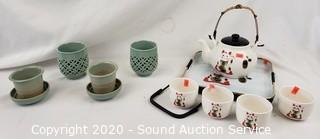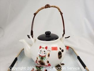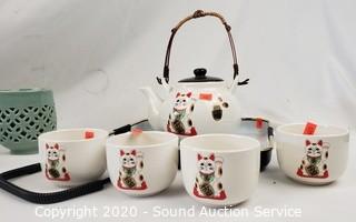 Lot #0034: Asian Lucky Cat Tea Set & Ceramic Planters